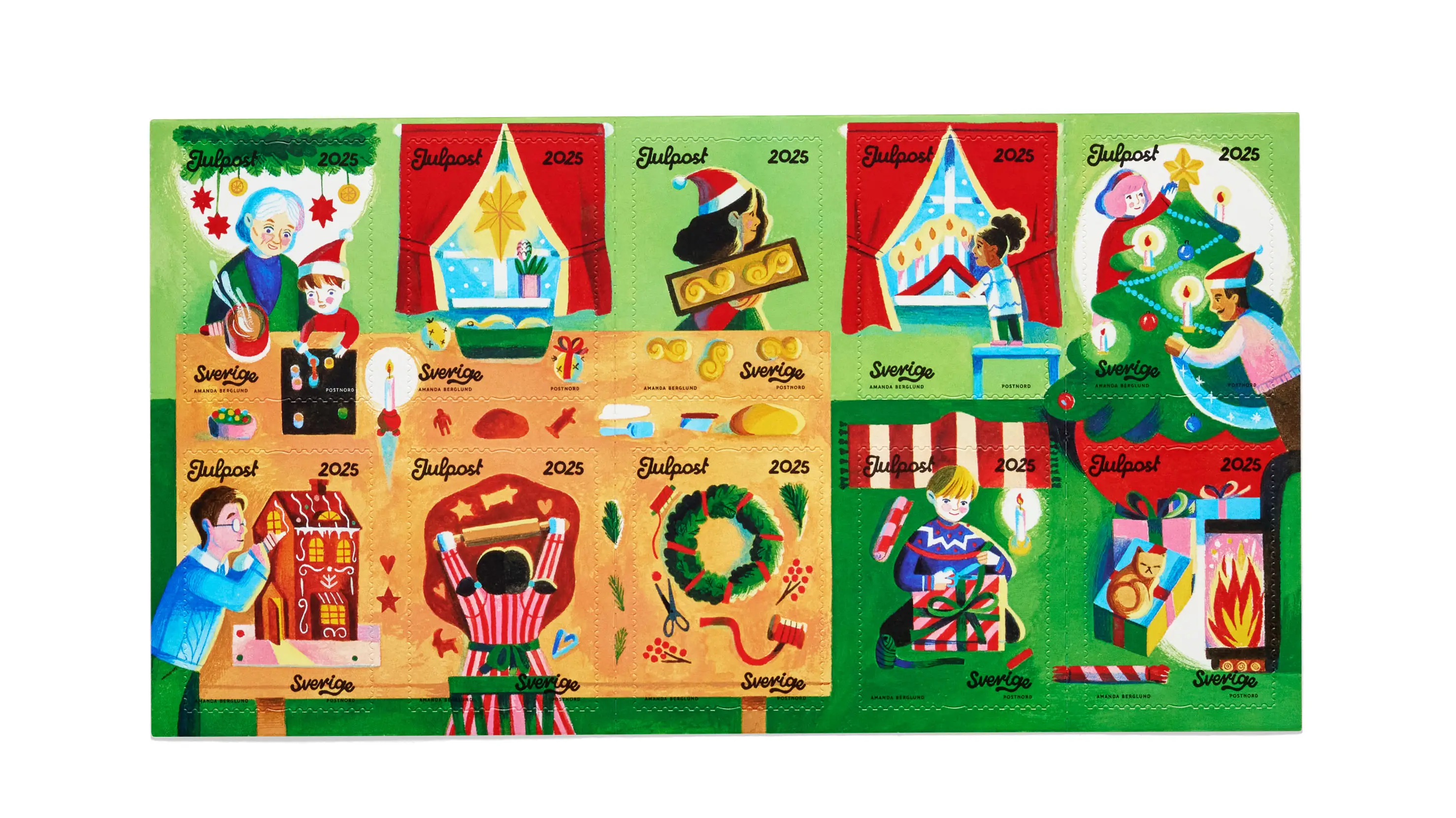 Amanda Berglund ger med sitt färgrika och uttrycksfulla manér liv åt årets jultema ’Julstök’. Ett julfrimärke kostar 17 kronor, säljs i häfte om 10 stycken och går att använda till och med den 31 december.